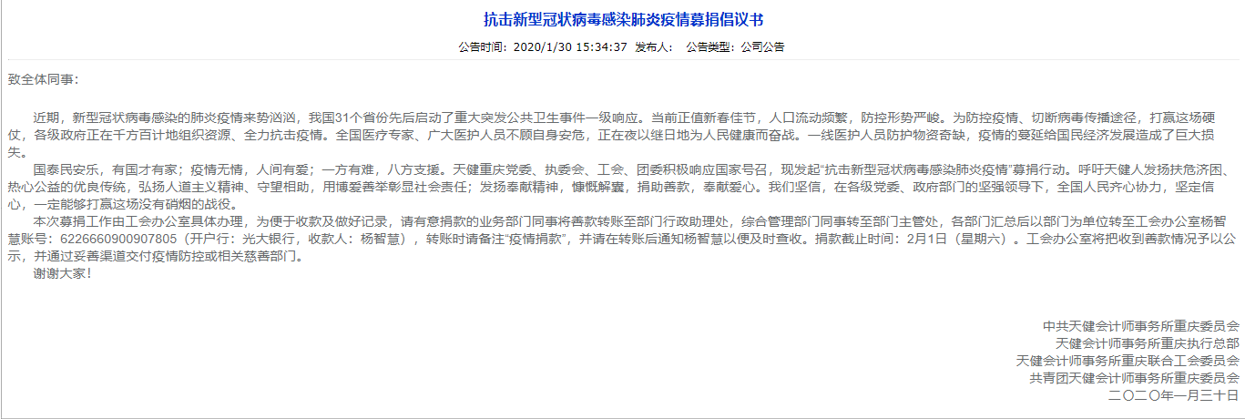 1月30日,重慶執行總部發布《抗擊新型冠狀病毒感染肺炎疫情募捐倡議書》,呼吁全體員工發揚天健人扶危濟困、熱心公益的優良傳統,用博愛善舉彰顯社會責任,齊心協力打贏這場沒有硝煙的戰役。391名員工積極參與、奉獻愛心,共募集善款101,790元。目前全部善款已捐至重慶市衛生健康委員會,為打贏疫情阻擊戰貢獻了天健人的一份力量。