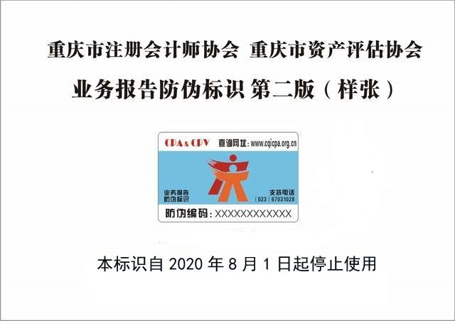 一、 自2020年8月1日起,資產評估報告(以資產評估報告日為準)停止使用重慶市資產評估協會第二版業務報告防偽標識,第二版業務報告防偽標識為紙質易碎不干膠,樣式如下: