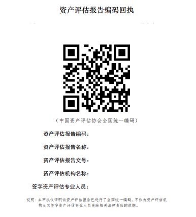 二、自2019年10月1日起,資產評估報告(以資產評估報告日為準)均應嚴格按照《中國資產評估協會資產評估報告統一編碼管理暫行辦法》要求,在向委托人提交資產評估報告前,均應登錄中國資產評估協會行業管理平臺“資產評估報告統一編碼系統”,錄入報告信息進行統一編碼,并將系統自動生成的“資產評估報告編碼回執”列裝在資產評估報告的扉頁位置。編碼回執樣式如下: